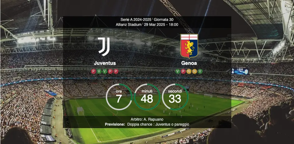Sabato 29 marzo 2025, alle ore 18:00, l’Allianz Stadium di Torino sarà teatro dell’incontro tra Juventus e Genoa, valido per la 30ª giornata di Serie A. La Juventus, reduce da due sconfitte consecutive, ha recentemente cambiato guida tecnica, affidando la panchina a Igor Tudor dopo l’esonero di Thiago Motta. Il Genoa, sotto la direzione di Patrick Vieira, sta vivendo un periodo positivo, con una sola sconfitta nelle ultime sei partite.