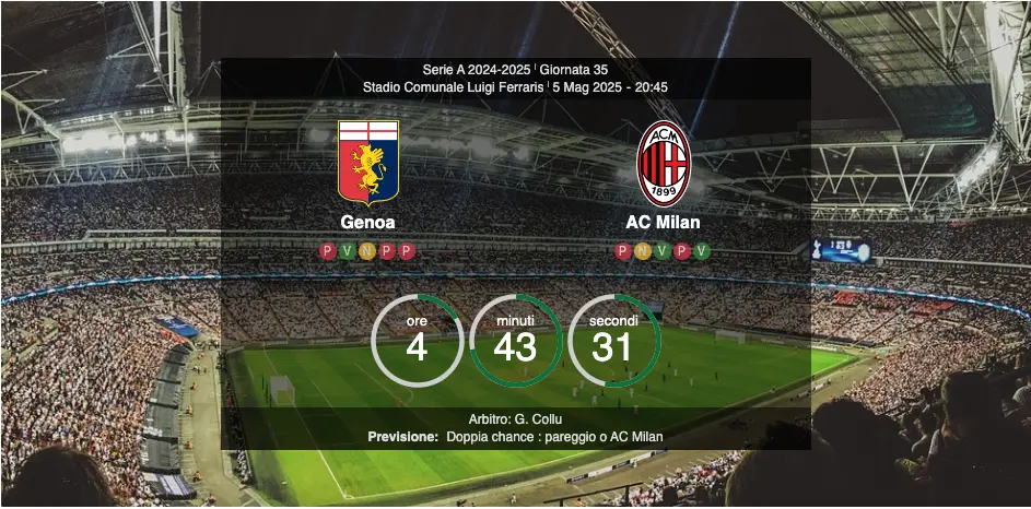 Lunedì 5 maggio 2025, alle ore 20:45, lo Stadio Luigi Ferraris di Genova sarà teatro della sfida tra Genoa e Milan, valida per la 35ª giornata del campionato di Serie A 2024/25. Un incontro che vede i rossoneri cercare di consolidare la loro posizione in classifica, mentre i rossoblù lottano per allontanarsi dalle zone pericolose della graduatoria.